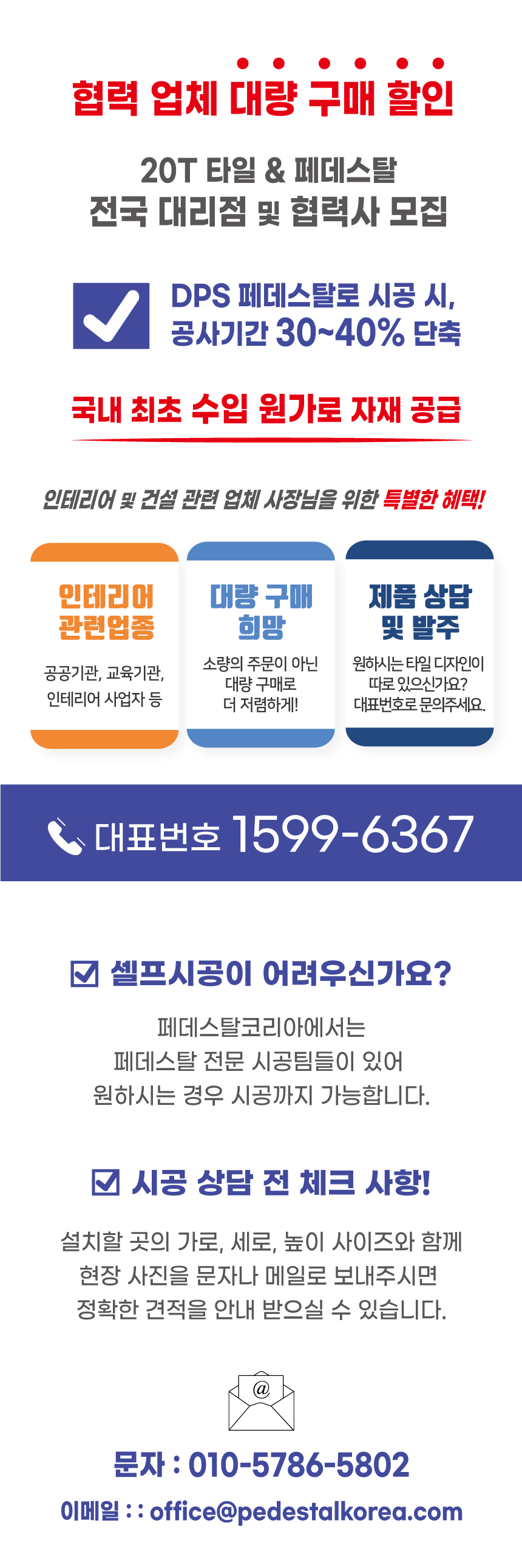 페데스탈코리아에서는 20T 타일 및 페데스탈 전국 대리점 및 협력사 모집중에 있습니다.